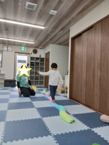 ボルダリングの壁にのぼったり、歌を歌ったり、バランスをとっておこなうサーキットトレーニング、